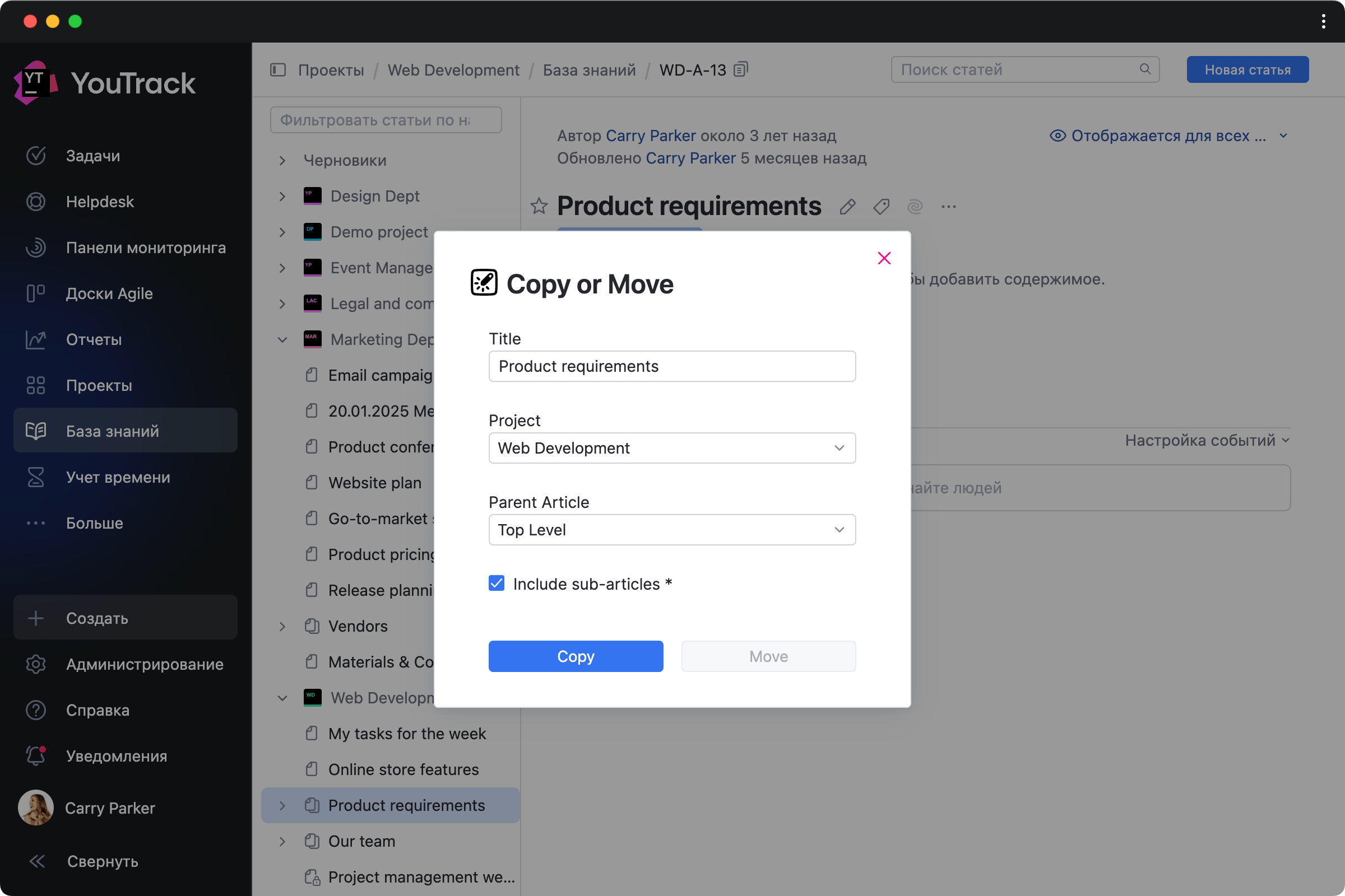Позволяет копировать и переносить статьи вместе с вложенными разделами внутри базы знаний.