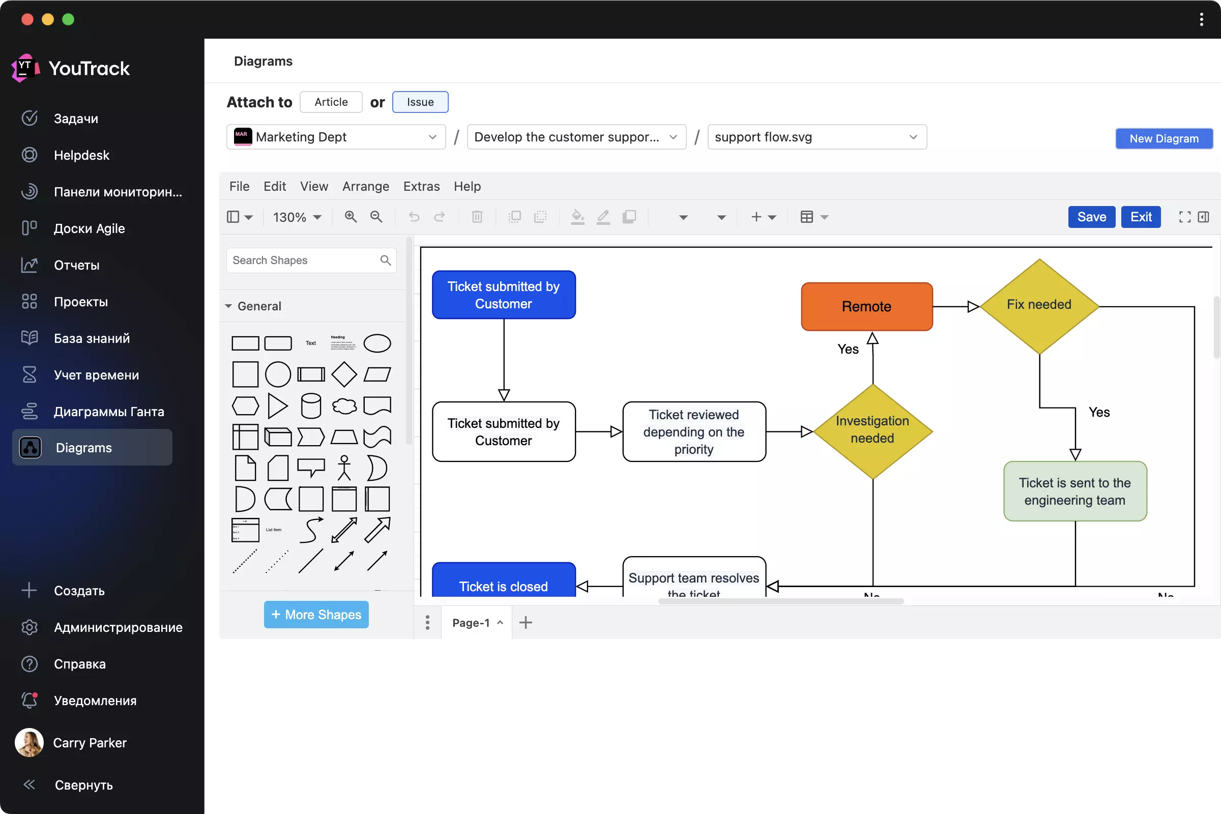 Создавайте и редактируйте диаграммы draw.io из нового раздела в главном меню YouTrack — Диаграммы. Добавляйте их в задачи и статьи для визуализации процессов.