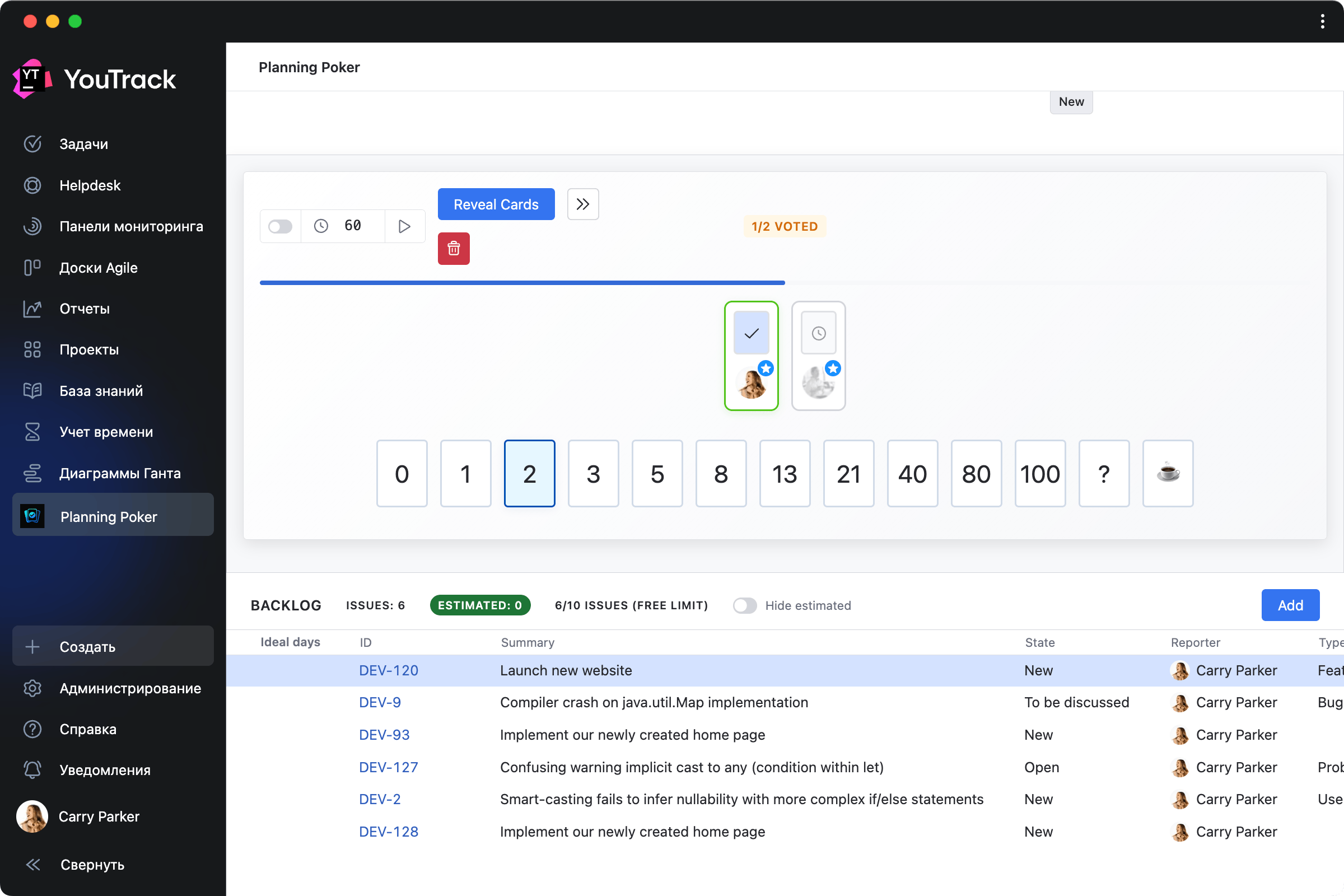 Помогает в игровой форме оценить очередь задач и упрощает распределение задач в реальном времени между членами команды.