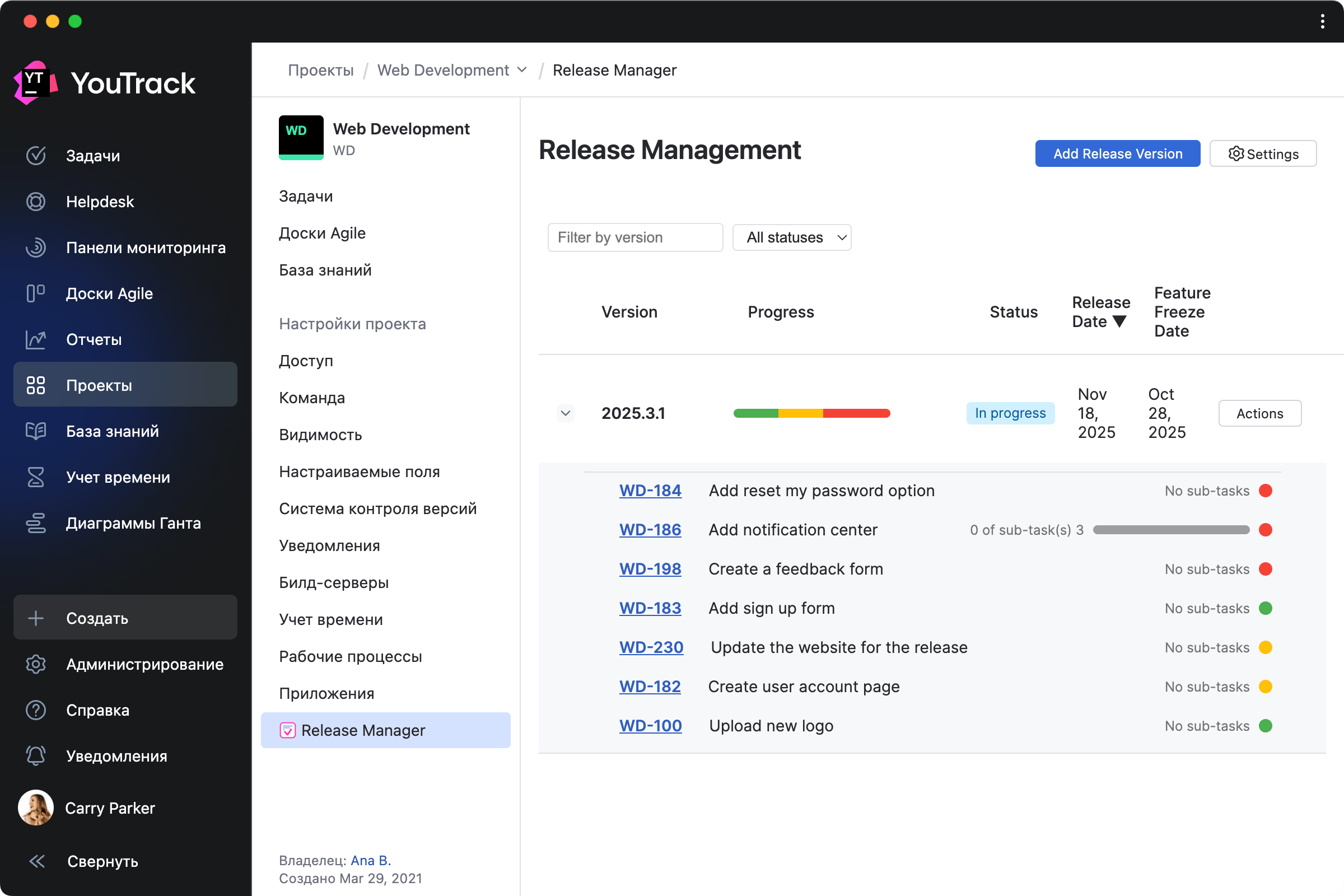 Обеспечивает управление релизами продукта благодаря отслеживанию их областей доступа на единой странице.