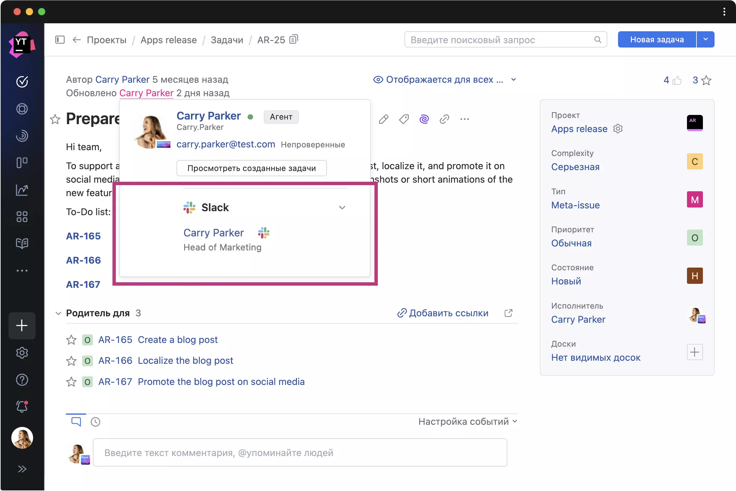 Добавляет информацию и статусы из Slack в карточки пользователей и позволяет начать обсуждение в Slack прямо из YouTrack.
