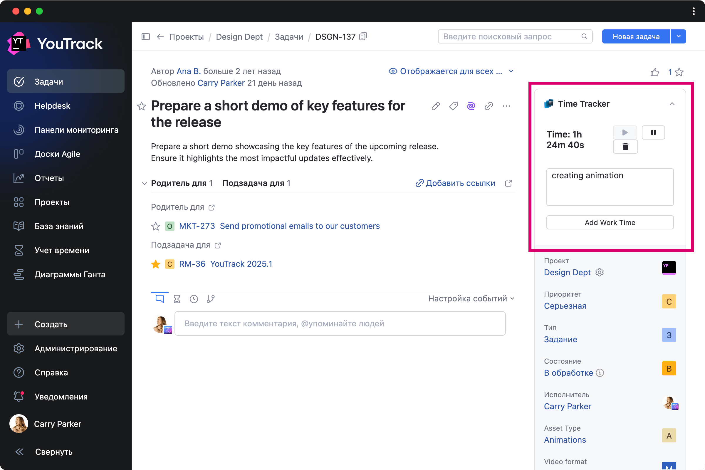 YouTrack включает готовые решения для автоматизации распространенных сценариев работы. Они позволяют, например, автоматически закрывать родительскую задачу при выполнении всех подзадач, повышать приоритет задач со временем, управлять дубликатами и отслеживать время.