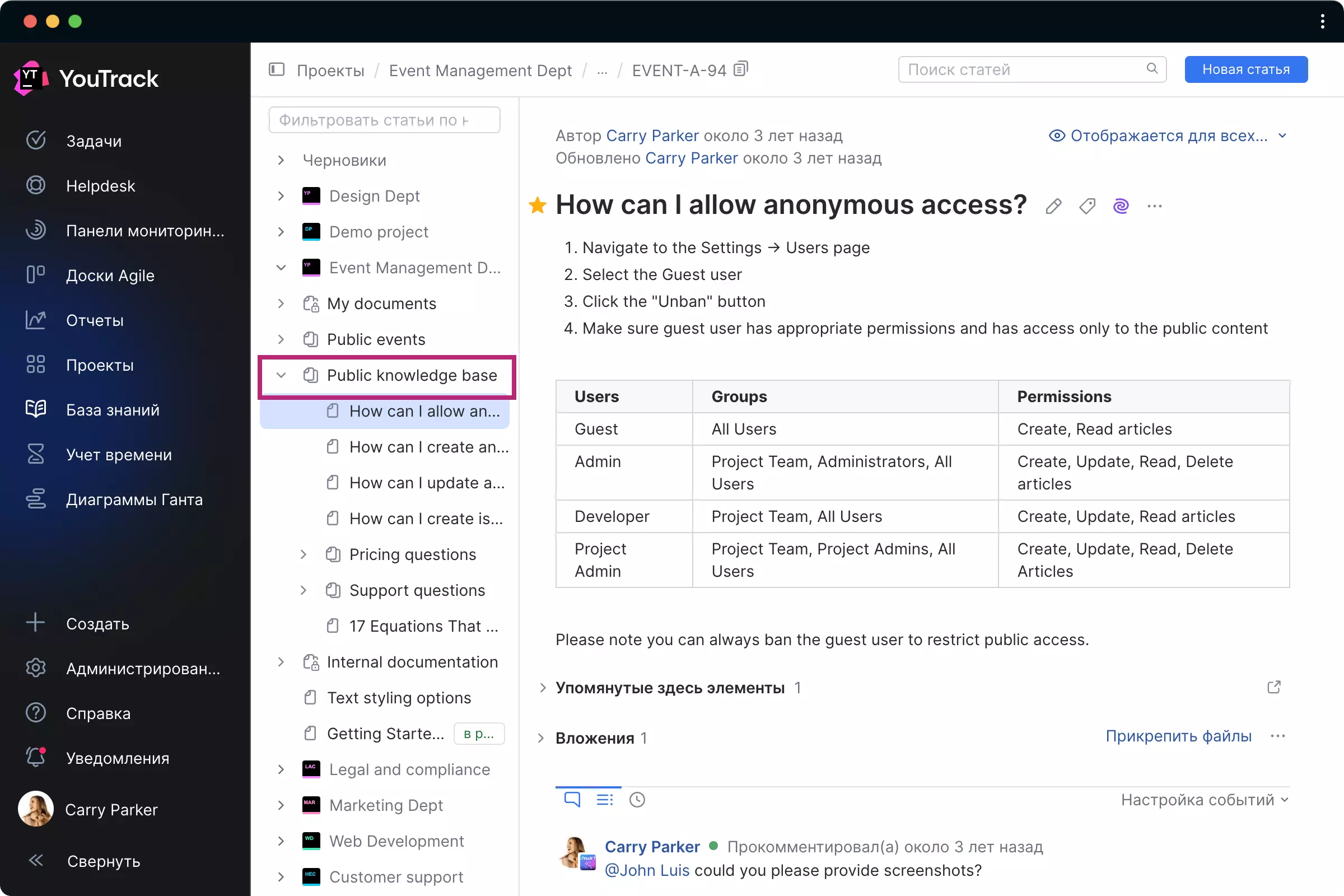 Вы можете опубликовать часть базы знаний в открытом доступе — так ваши клиенты и поисковые движки смогут находить статьи и ответы на часто задаваемые вопросы о вашем продукте, не регистрируясь в YouTrack. С помощью фильтров, тегов и полнотекстового поиска ваши клиенты легко найдут то, что им нужно, а функция комментирования позволяет зарегистрированным пользователям задавать вопросы. Если вы хотите собрать отзывы, воспользуйтесь приложением «Article Feedback», чтобы понять, что думают клиенты.