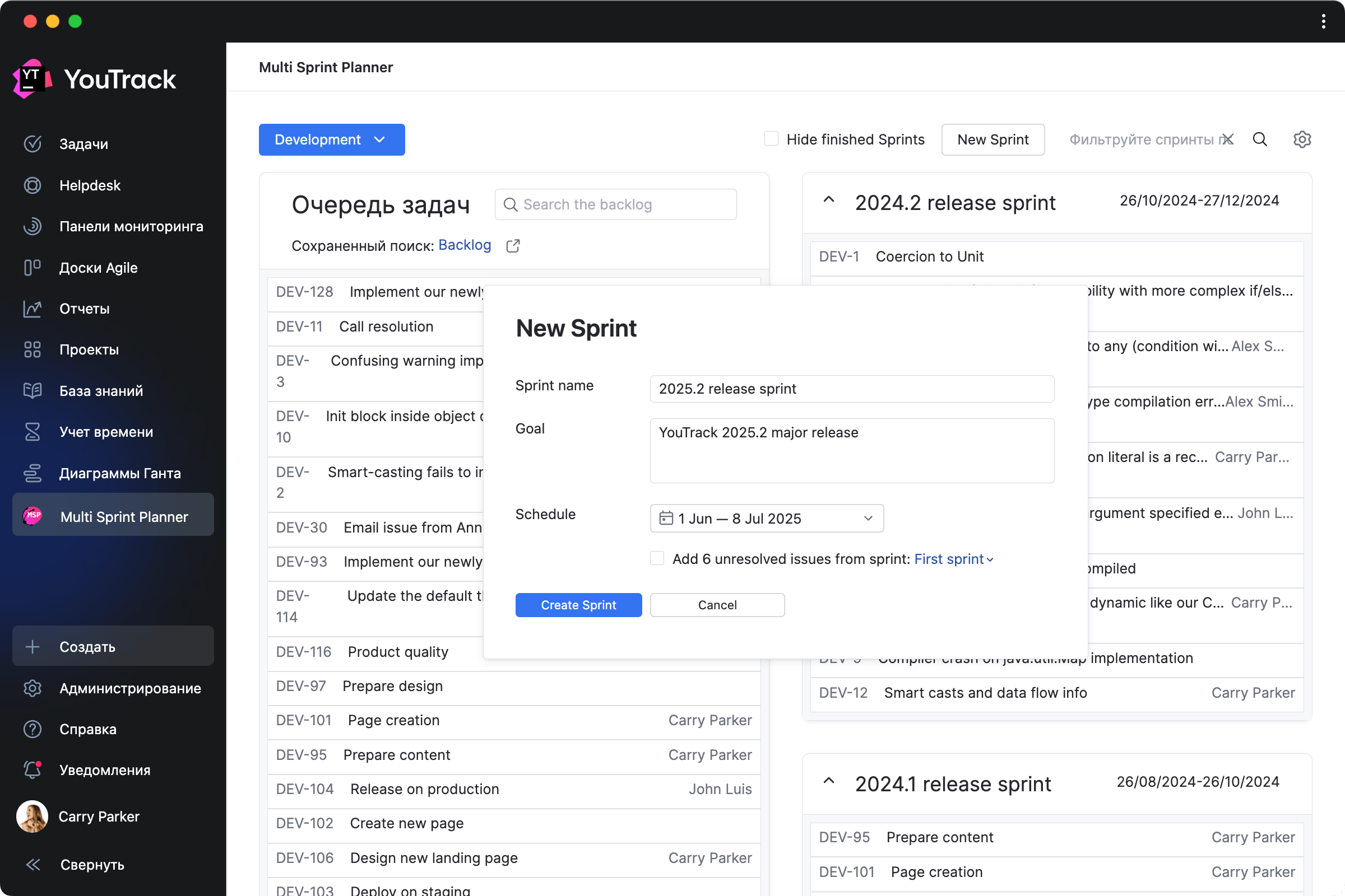 Agile-доски YouTrack поддерживают Scrum и Kanban, а также позволяют использовать любые смешанные методологии для планирования, управления задачами и отчетности.