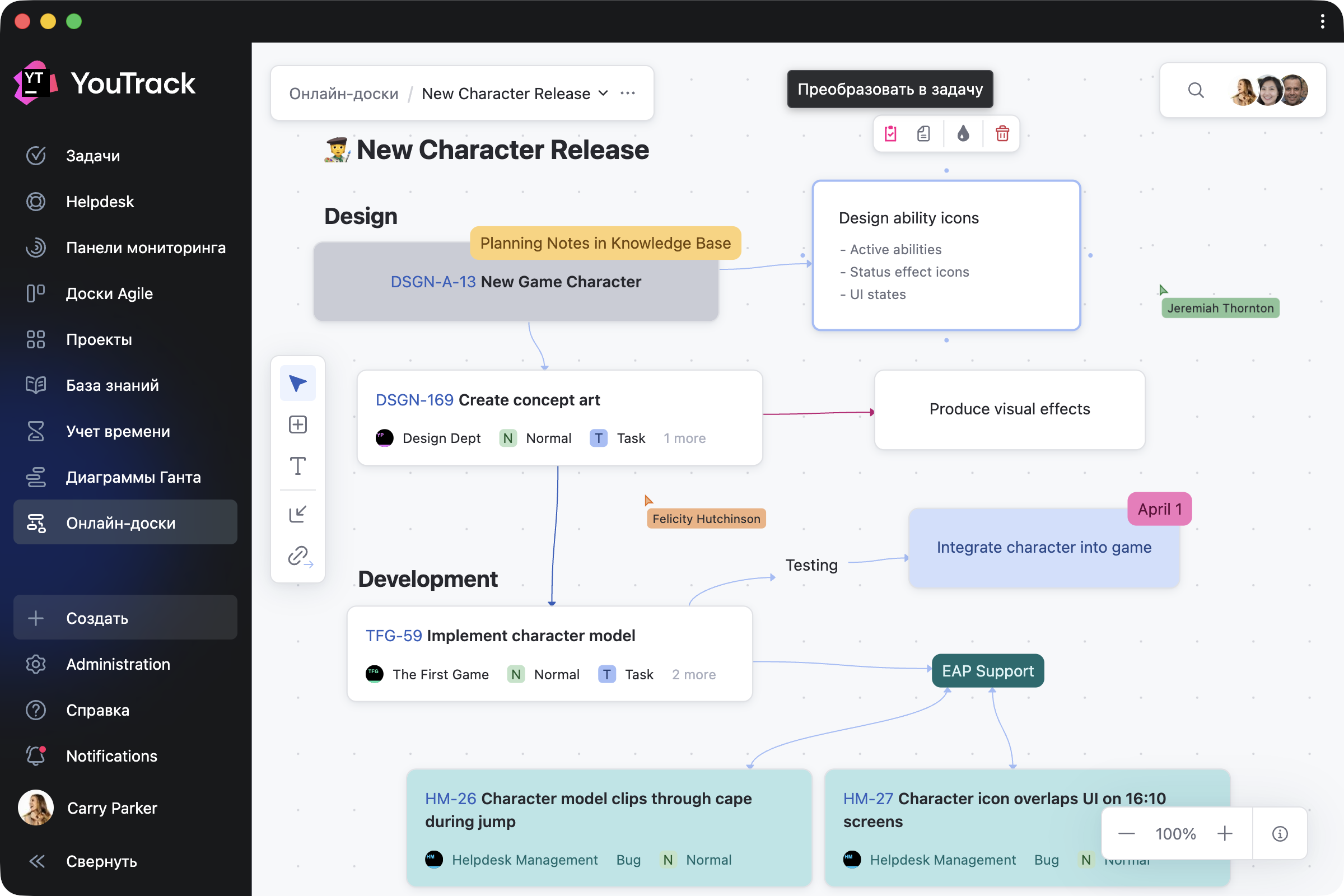 Планирование нередко начинается еще до того, как работа обретает четкую структуру. Онлайн-доски в YouTrack — это гибкое визуальное пространство, где можно обрисовывать планы, фиксировать текущую работу и продумывать следующие шаги — самостоятельно или вместе с командой. Добавьте существующие задачи, запросы и статьи или начните с чистого листа. Когда идеи оформятся, превращайте их в задачи одним кликом — зависимости синхронизируются автоматически.
