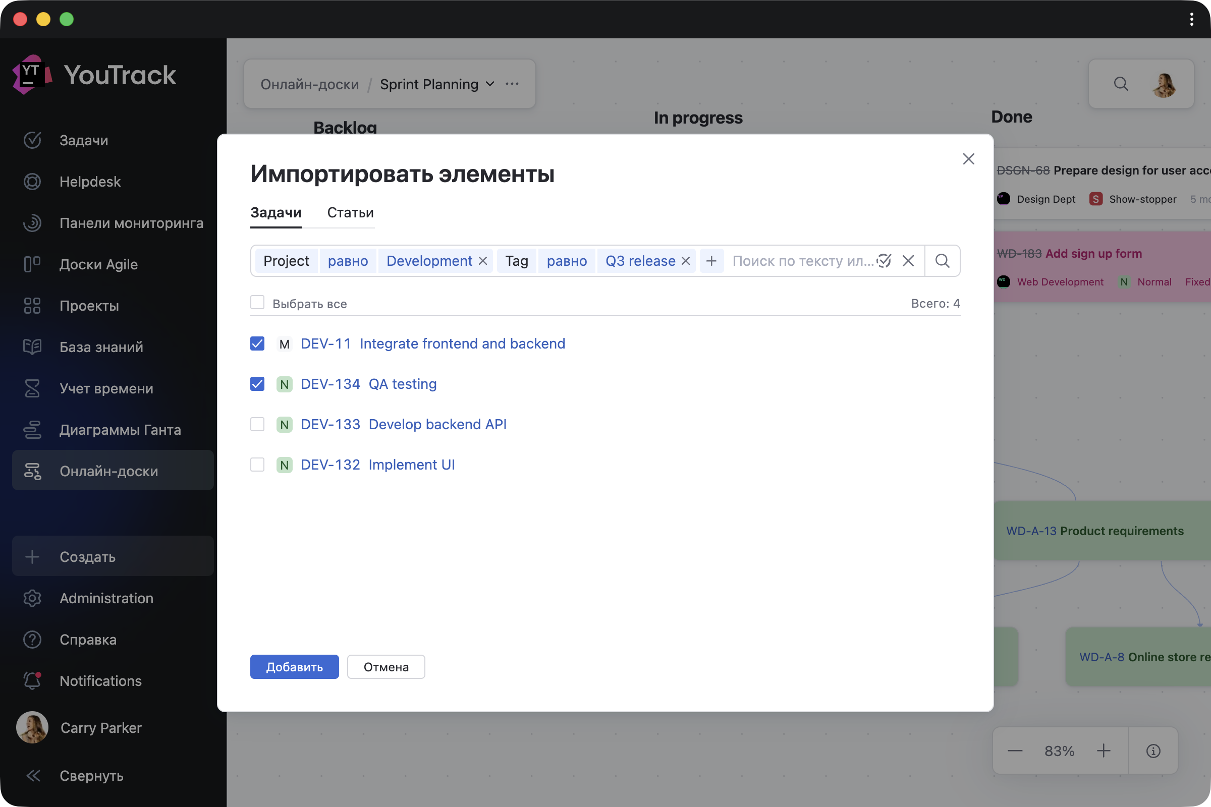 Переносите существующие задачи, тикеты и статьи на онлайн-доску и редактируйте их прямо там по мере изменения планов. Все изменения мгновенно отражаются в ваших проектах. Добавляйте задачи из очереди во время планирования, прикрепляйте нужные статьи или используйте доску как актуальный обзор текущей работы.