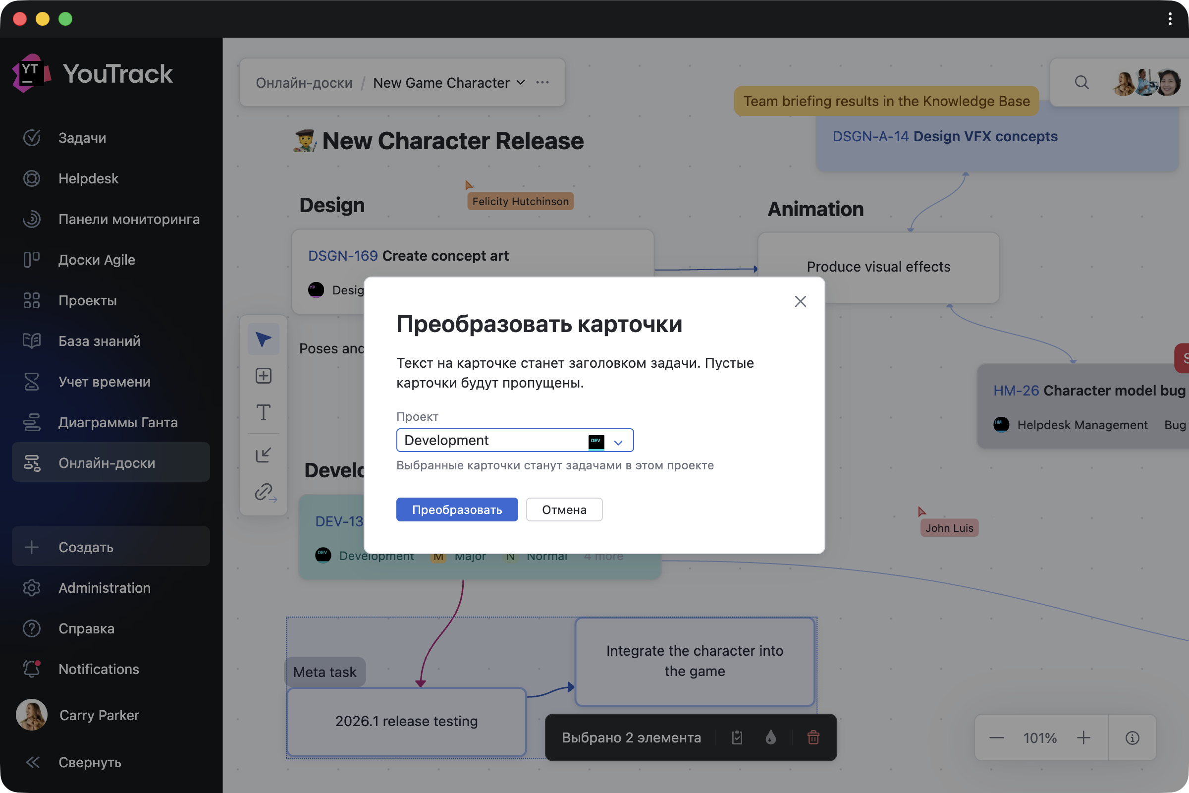 Выберите любую карточку, укажите проект, добавьте подробностей — и она превратится в реальную задачу или статью. Преобразуйте элементы по одному или все сразу, когда обсуждение будет завершено. Зависимости между задачами синхронизируются автоматически — никаких дополнительных действий не требуется.