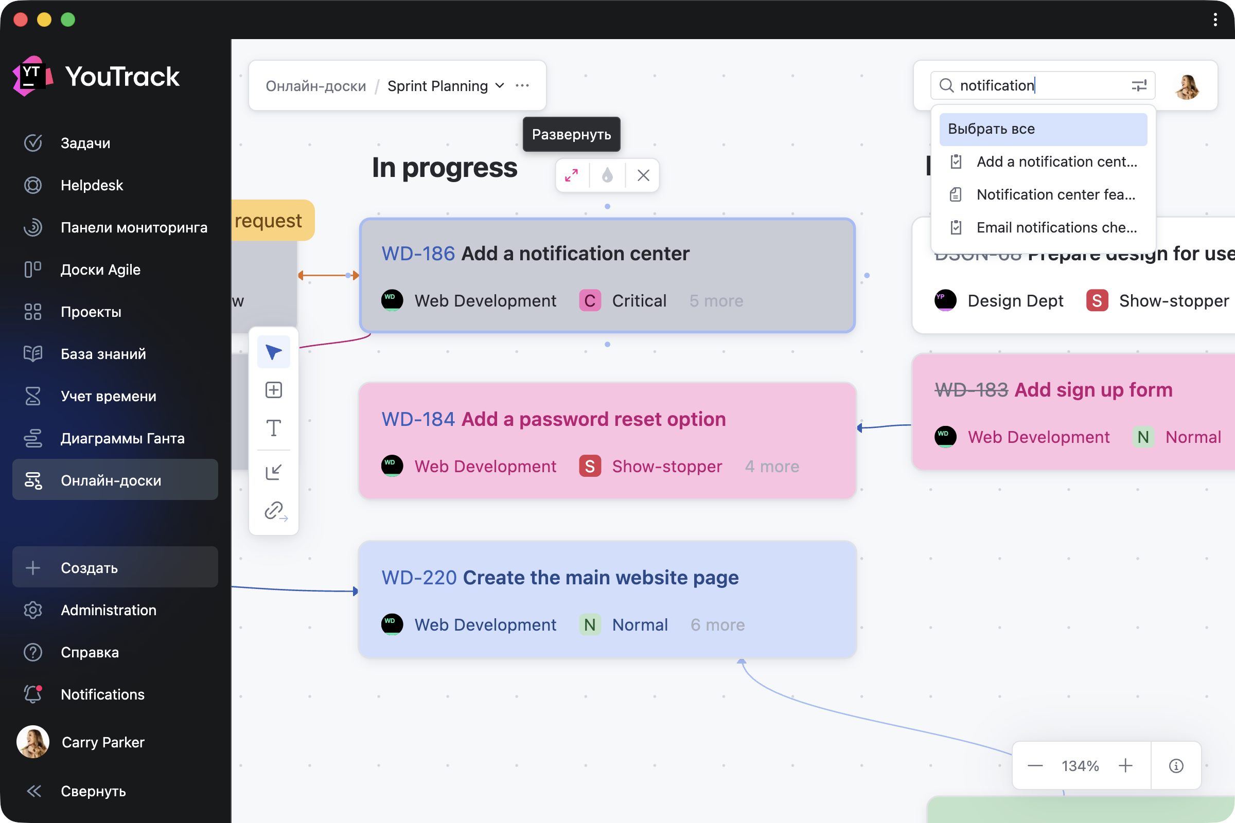 Начните с чистого листа или добавьте готовый контент из проектов: задачи, запросы, статьи и любые накопленные заметки. Превращайте идеи в задачи и статьи YouTrack одним кликом. Связи между элементами на доске автоматически синхронизируются с проектом — и наоборот.