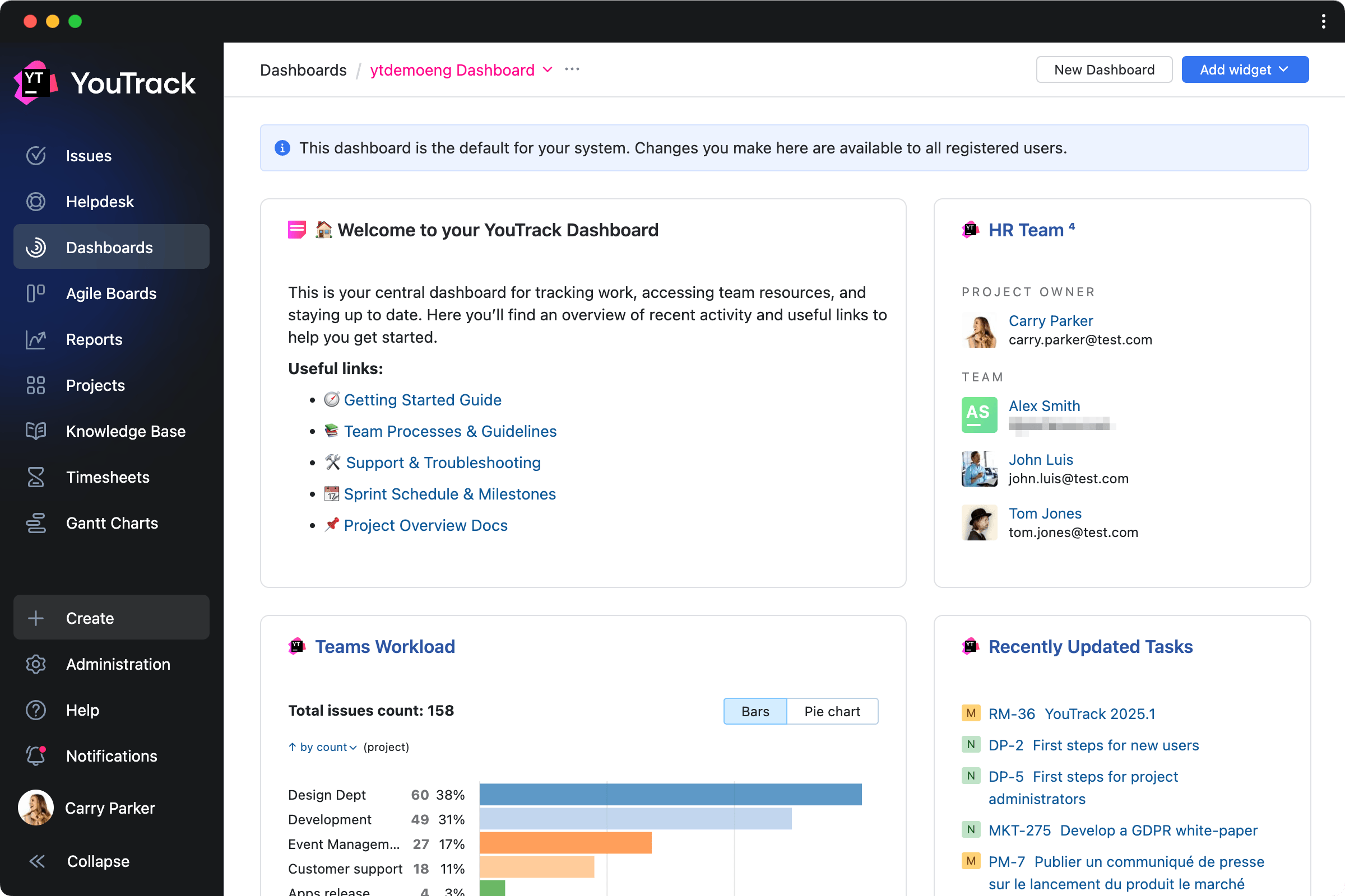 YouTrack comes with a standard selection of widgets. You can install additional apps that contain dashboard widgets from JetBrains Marketplace and even create your own custom apps.