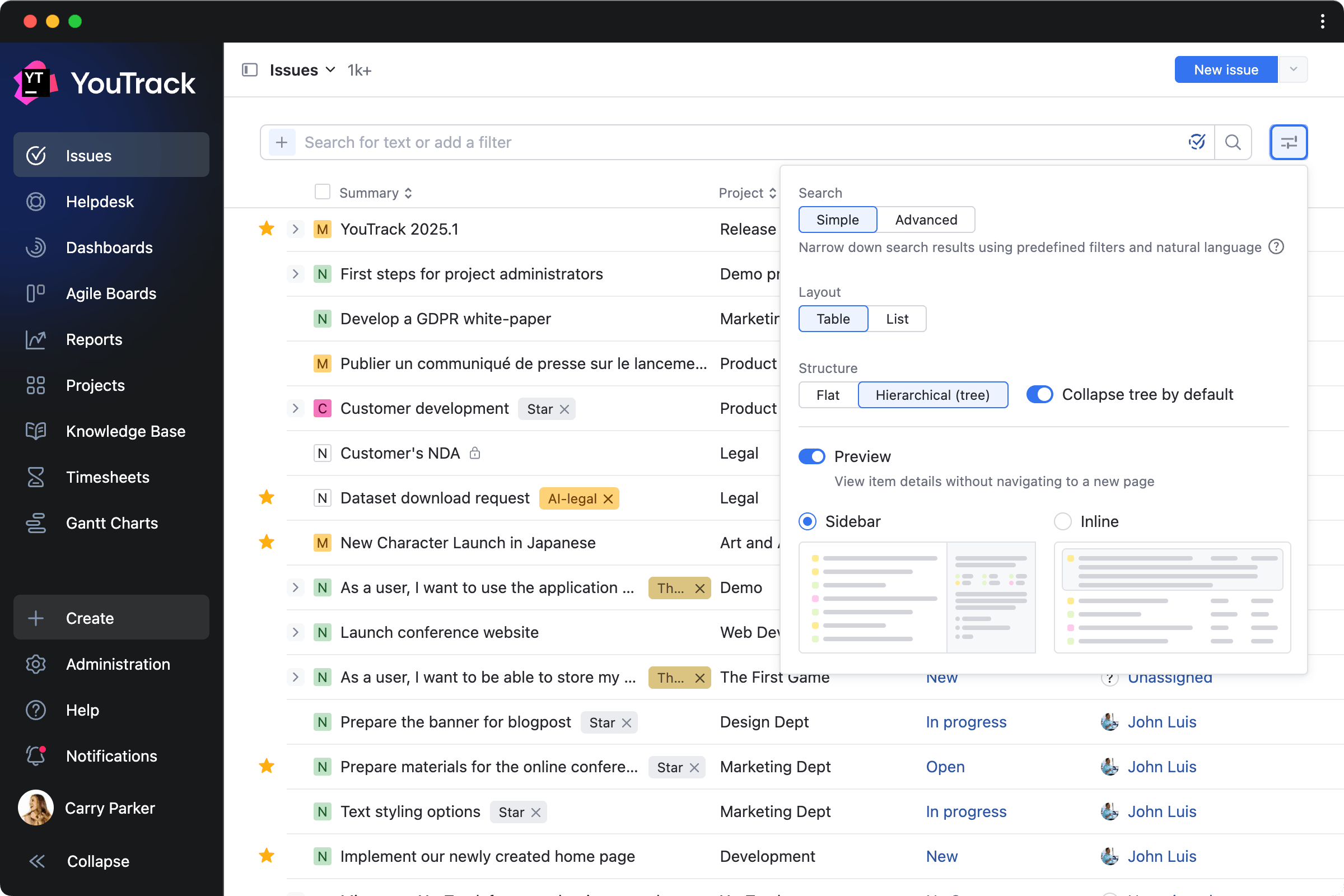 Shareable, intuitive filters and the advanced query language search option ensure that the tasks you need to track are always clearly visible to you and your team. You can easily search for text or use dynamic filters that suggest possible search values, or you can create complex search requests using query mode. Then you can save the search to come back to it at any time, and even share it with the team to keep everyone up to date.