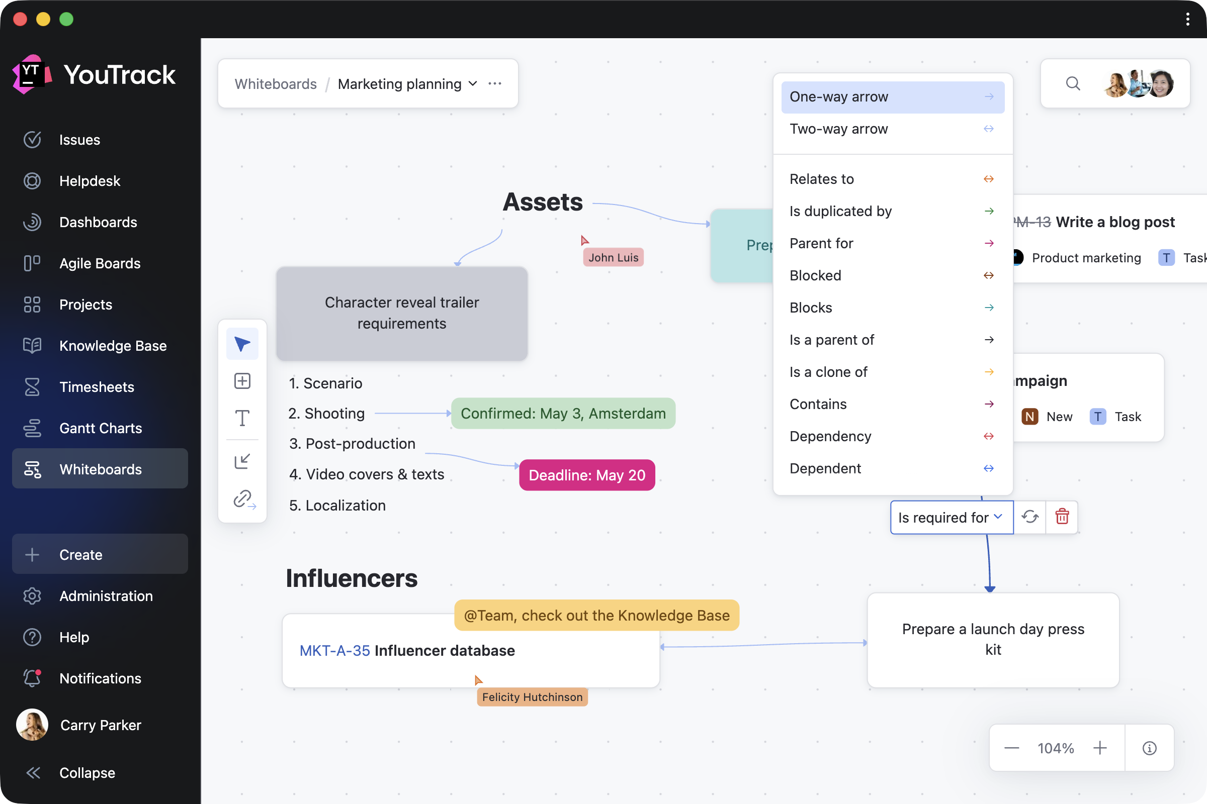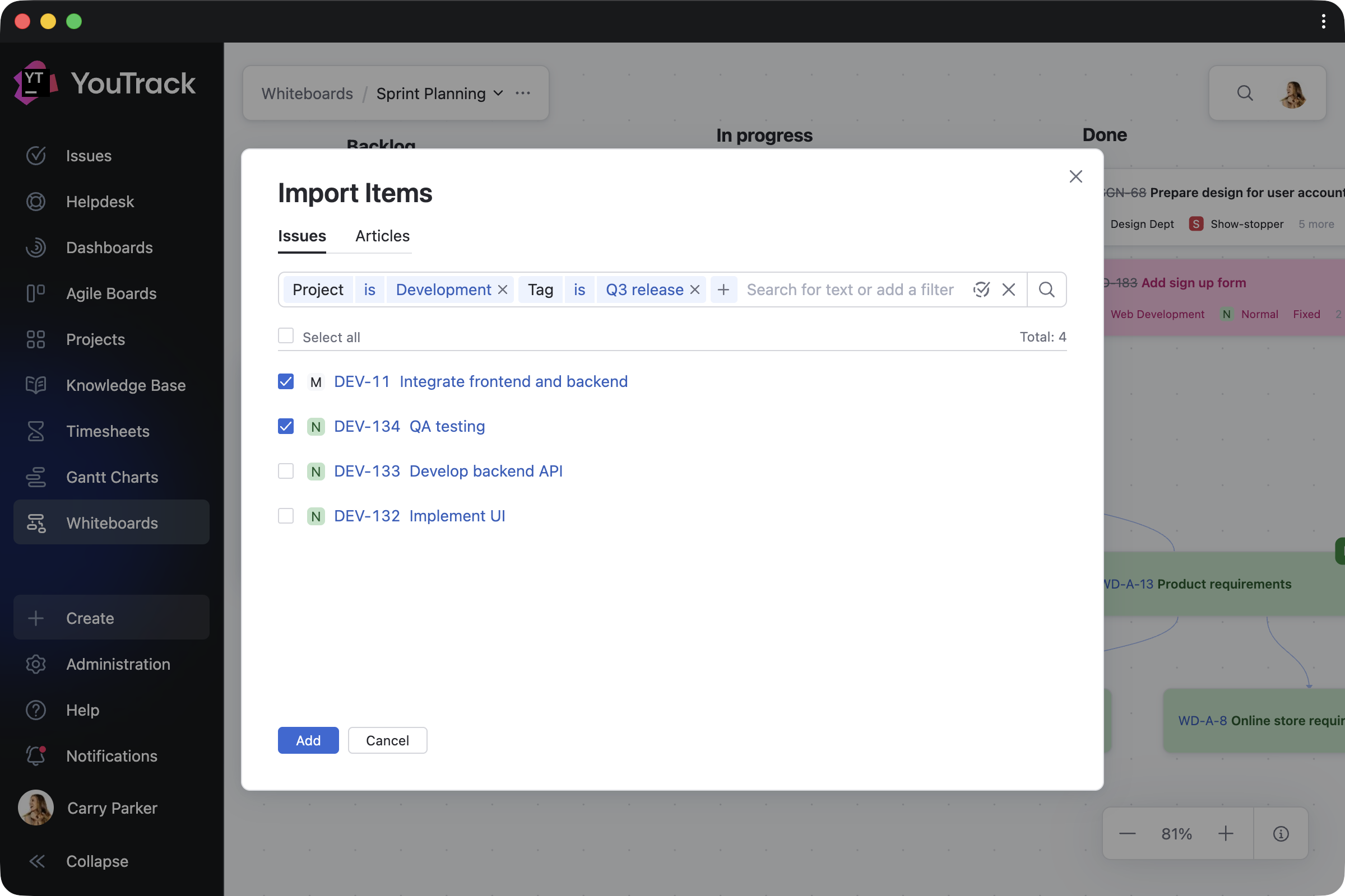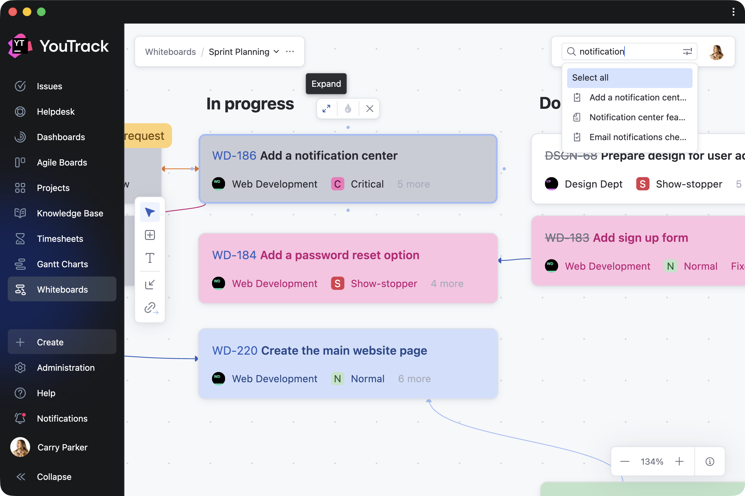 Bring existing tasks, tickets, and articles onto the Whiteboard and update them directly as your plans evolve. Every change is instantly reflected across your projects. Add backlog tasks to a planning session, link relevant articles, or use your Whiteboard as a living overview of ongoing work.