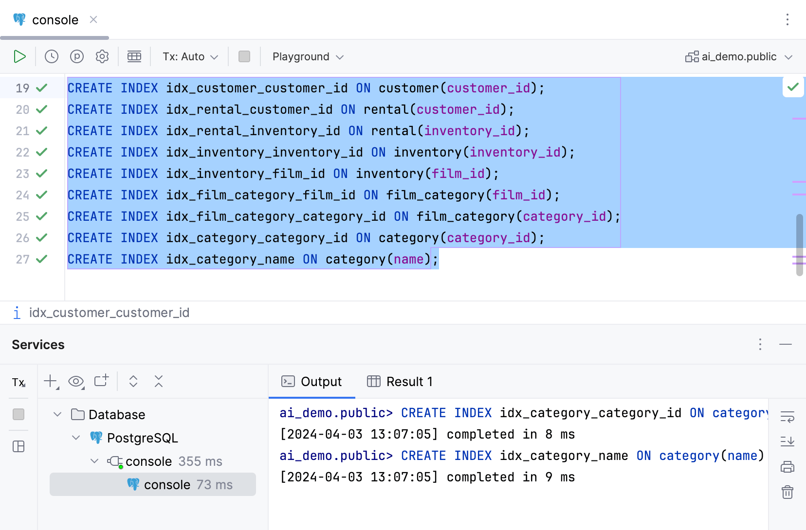 IDE 将创建已定义的数据库对象,您可以在 输出 标签页的 Services 工具窗口中查看输出。