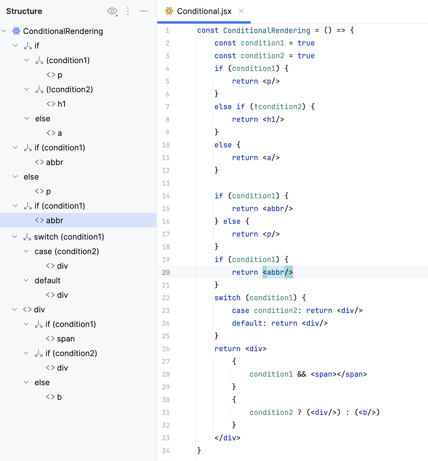 结构 工具窗口显示以下特定于 React 的节点: