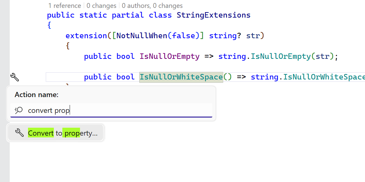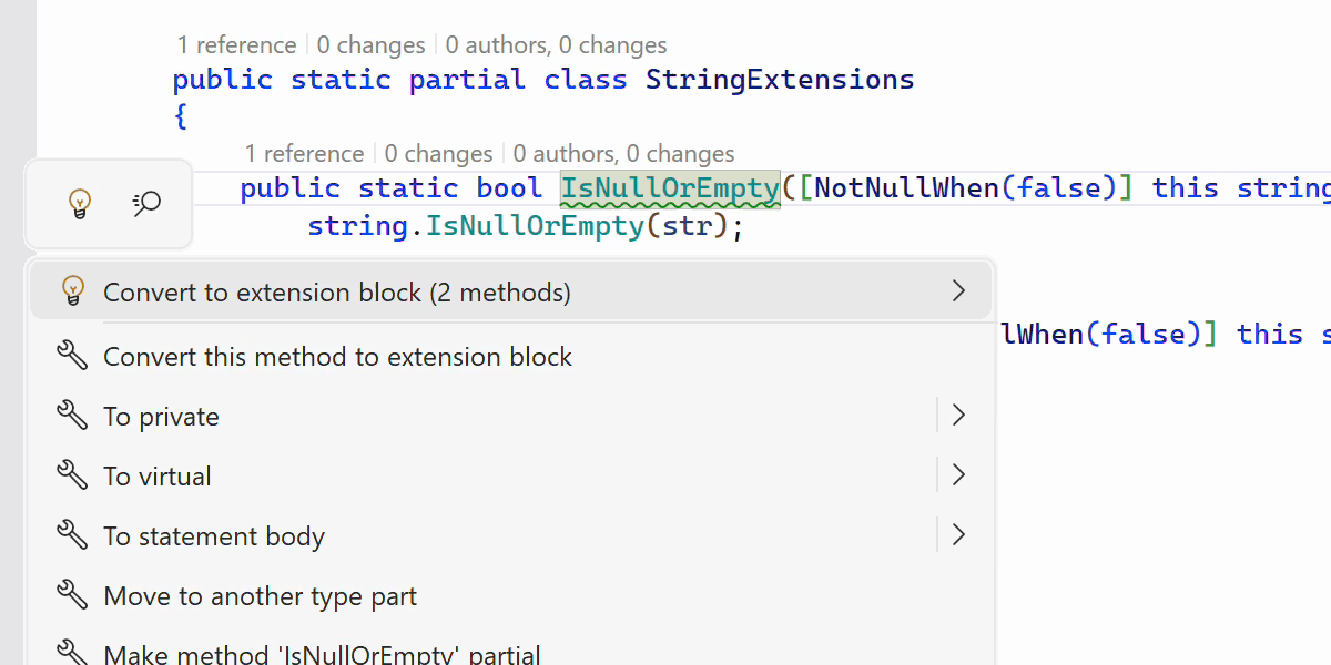最后但同样重要的是,新增的检查、快速修复和上下文操作可以帮助您在经典扩展方法与新语法之间顺畅切换。