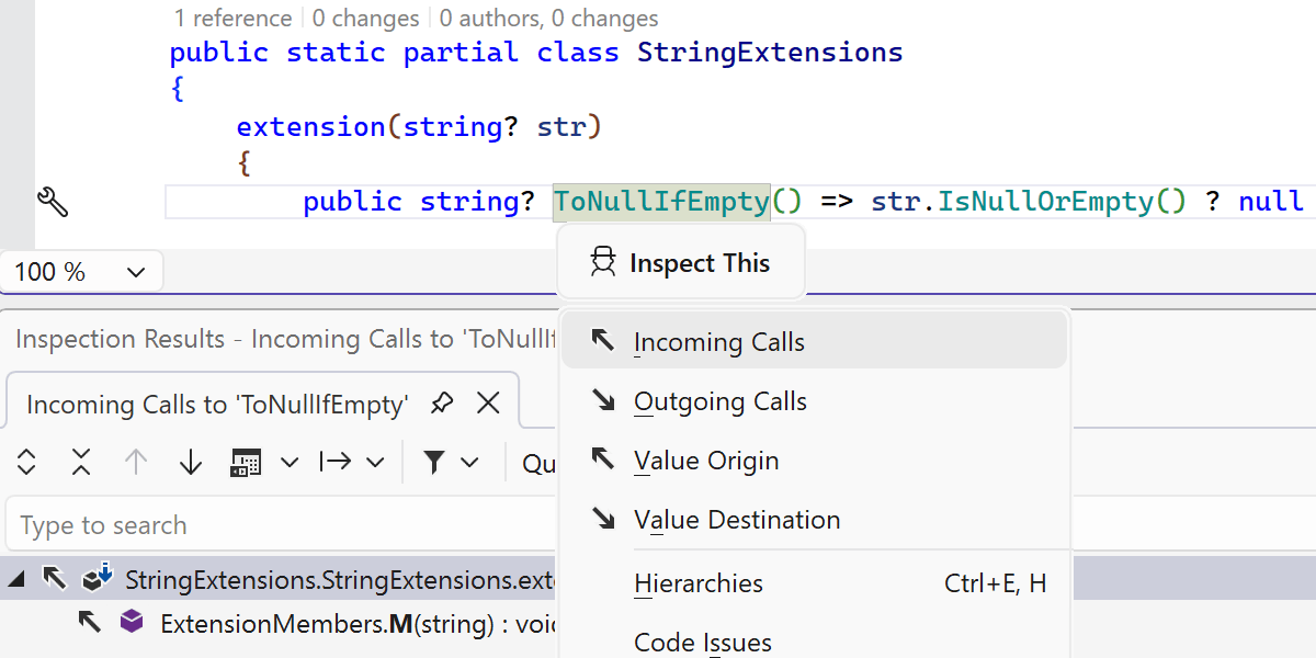 • Call Hierarchy(调用层次结构)和 Value Tracking(值跟踪)功能支持新的扩展成员,这样,可以对涉及扩展成员和属性的调用图和数据流进行可靠探索。