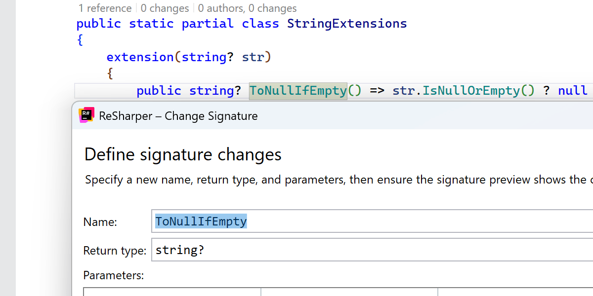 我们已敲定并完善对 C# 14 扩展的支持,在之前支持的方法和属性的基础上,增加了对扩展运算符的支持。 此外,还更新了所有可用重构,包括 Change Signature(更改签名)、Convert Method to Property(将方法转换为属性)、Make Static(设为 static)和 Safe Delete(安全删除),以便支持扩展成员。