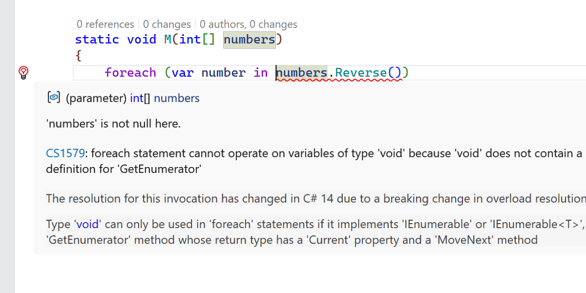 • 一项新增的检查可以检测出在 Enumerable.Reverse 与 span 配合使用时带来的重大更改。