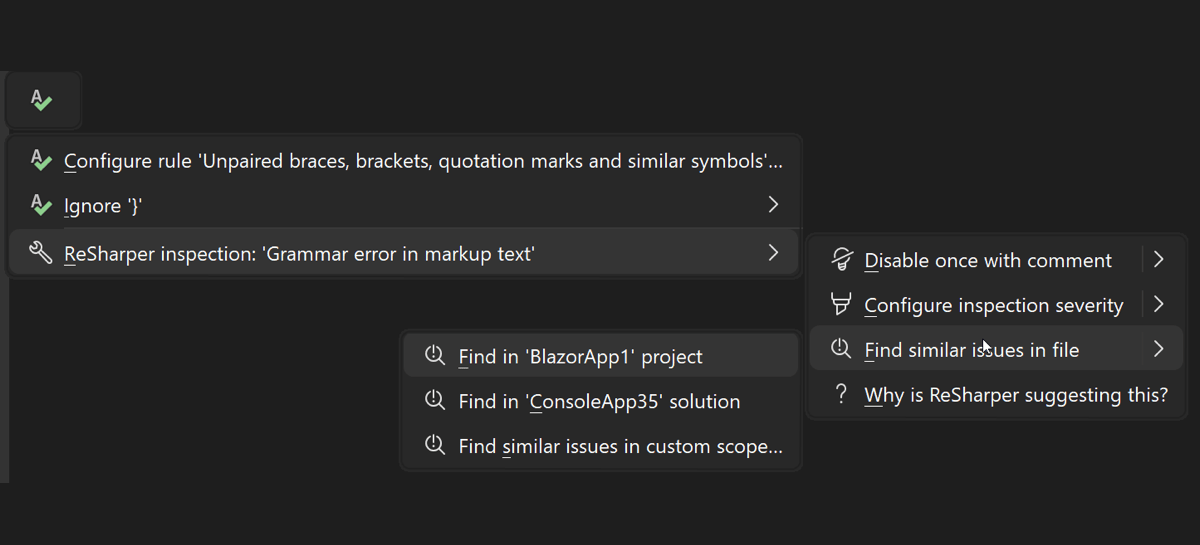 您可能还会注意到,Visual Studio 2026 中的 ReSharper 采用全新外观。 我们重新设计了弹出窗口和下拉菜单,以及多个工具窗口(如 Find Results(查找结果)、Unit Tests(单元测试)),使其外观更加流畅,与不断演进的 Visual Studio UI 相得益彰。