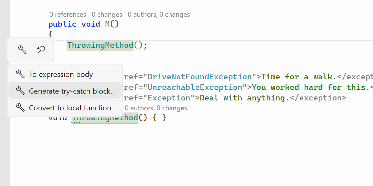 此版本新引入了一项新的上下文操作,可以根据 XML 文档自动在方法调用周围生成 try-catch 块。