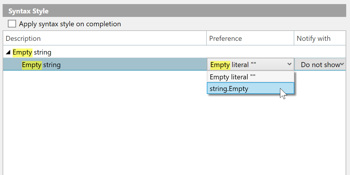 • A syntax style option for empty strings, allowing you to choose between string.Empty and "".