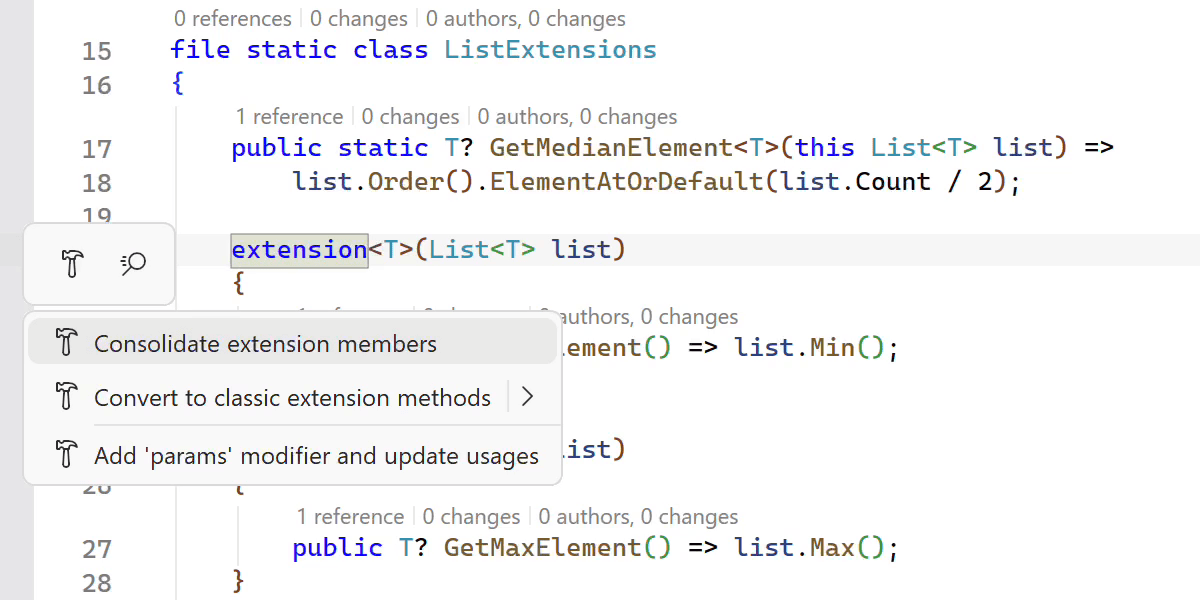 A new Consolidate extension members context action merges compatible extension declarations and classic extension methods into a single block. The Import extension member quick-fix has also been improved and now supports all kinds of extension members, automatically adding missing using directives when needed.