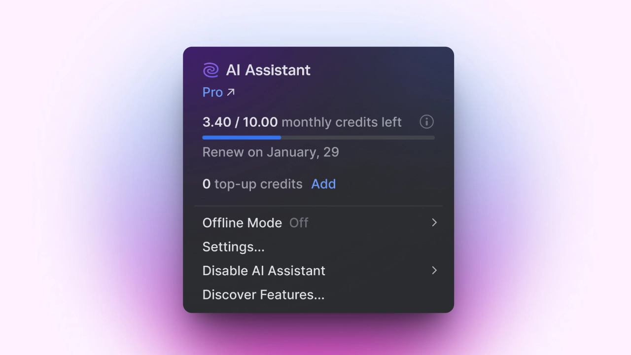 在 Junie 中,如果您的任务使用的 AI 点数超过 1.2,您就会收到通知。 此功能目前在 Junie 插件中提供,并且将很快登陆 AI 聊天。