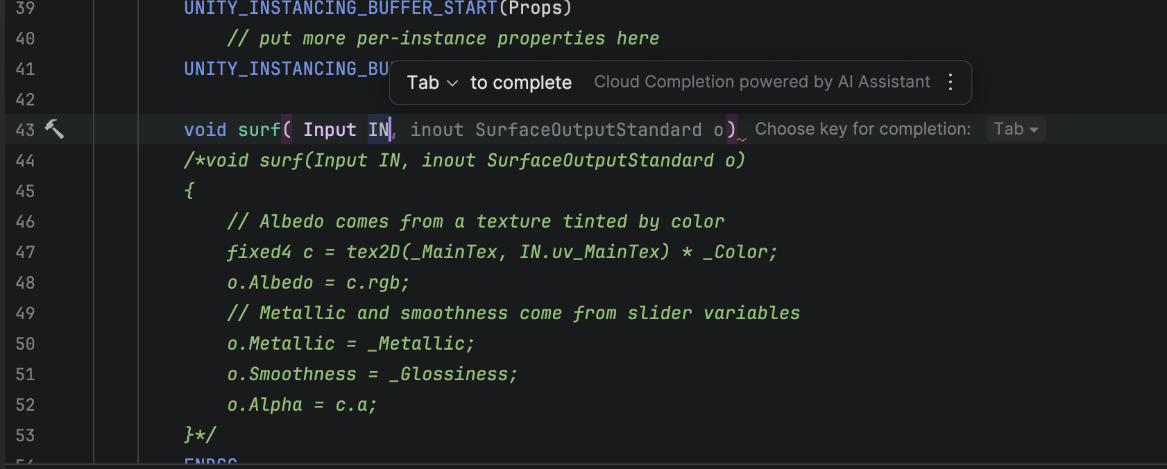 Rider 现在可为 Unity、Unreal Engine 和 Godot 项目中的着色器提供云支持的多行代码补全。 对于 Godot 开发者,云补全建议也适用于 GDScript 文件。