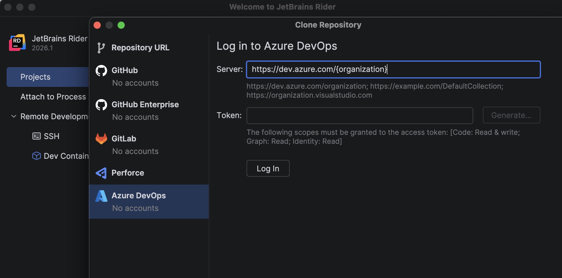 To get started, go to File | Open | Get from Version Control and select Azure DevOps from the list of providers. Rider authenticates you using a personal access token (PAT) and then displays the repositories available to your account so you can clone them directly from the IDE.