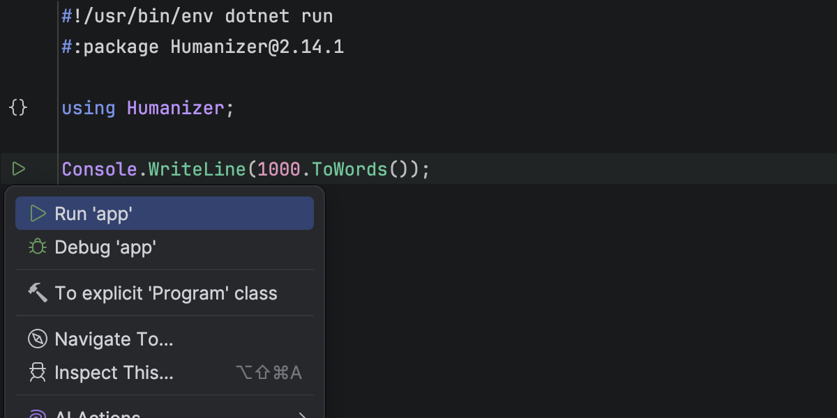 Rider 的编辑器可以识别包含顶层语句、#! shebangs, and #: directives, including #:package and #:sdk. 代码高亮显示、代码补全、运行标记和调试功能均已提供,让您可以快速创建以单个 C# 文件形式编写的脚本、原型和一次性工具。