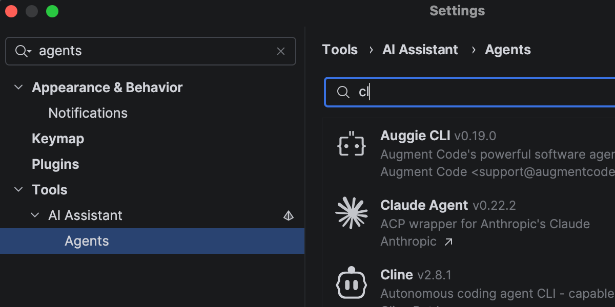 In addition to Junie, Claude Agent, and Codex in the AI chat, you can now choose from a wider range of agents, including GitHub Copilot and Cursor, and dozens of external agents supported via the Agent Client Protocol. 通过新增的 ACP 注册表,您可以发现可用智能体并一键安装。