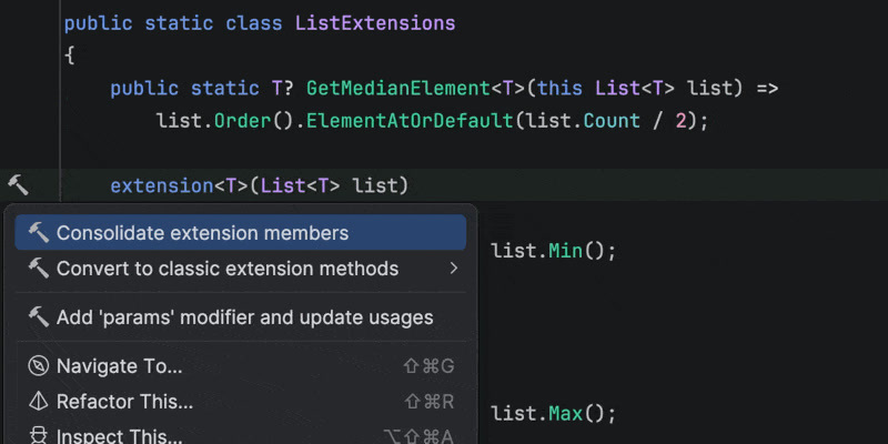 Rider 2026.1 brings improvements to code analysis, new inspections, and support for evolving language features. Enhanced support for C# extension members includes better navigation and refactorings, as well as improved quick-fixes that automatically import missing extension members when needed.