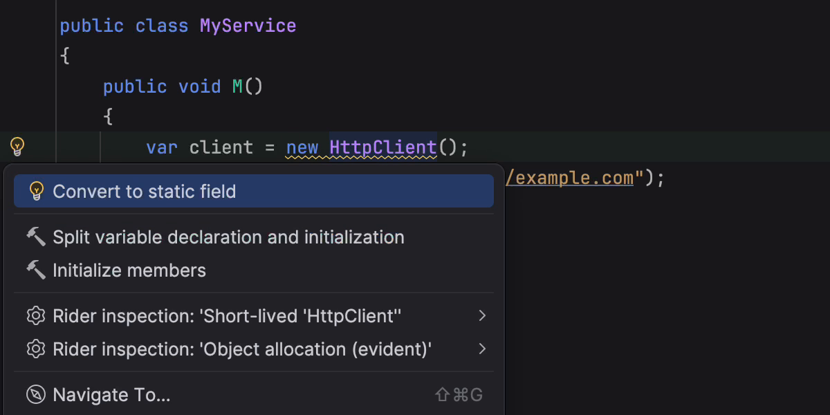 This release also introduces early support for C# 15 Preview language features, such as collection expression arguments and the [ExtendedLayout] attribute, helping you experiment with new syntax as the language evolves. In addition, several new inspections and style options help catch subtle issues, such as short-lived HttpClient instances or incorrect use of ImmutableArray<T> with collection initializers.