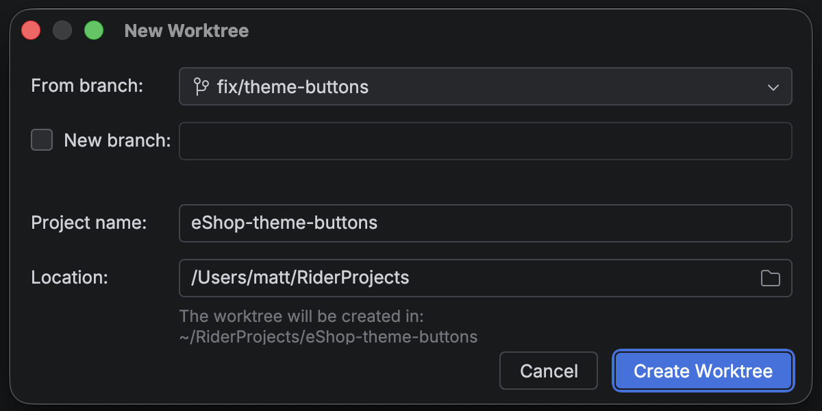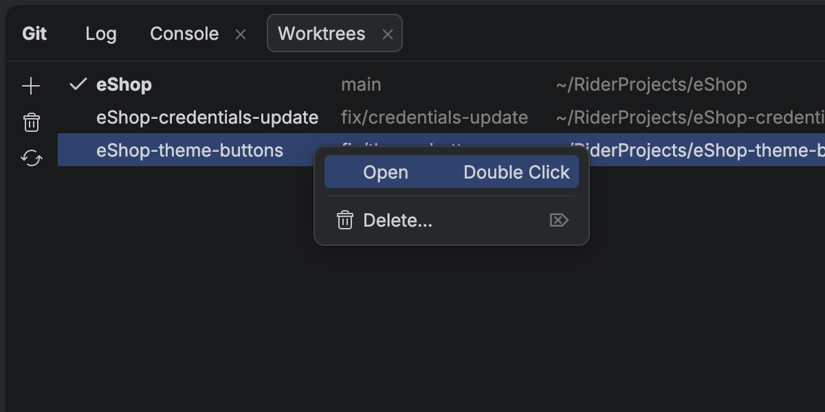 随着 AI 智能体的发展,并行运行多项任务已成为大幅节省时间的主要方式,而这正是 Git 工作树最擅长的工作。 To support cutting-edge workflows for AI-boosted software development, Rider now provides first-class support for Git worktrees. 为紧急的修补程序创建一个单独的 工作树,将另一个工作树交给 AI 智能体,并在 main 分支中继续工作 – 这些都可以同时进行,毫不干扰。