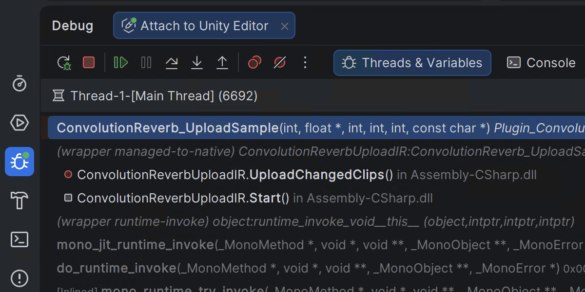 On macOS, you can debug Unreal Engine games running on iOS devices directly from Rider. 设置断点、检查变量、逐步执行代码,并分析调用堆栈 – 一切都可以在熟悉的调试器界面中完成。