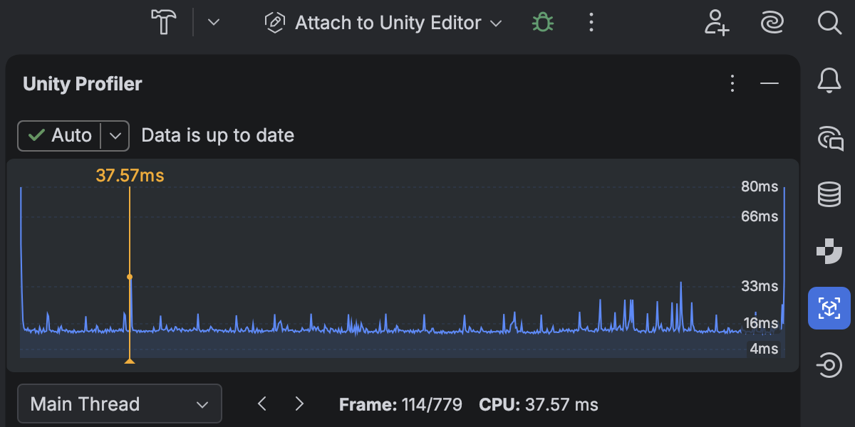 You can now open Unity Profiler snapshots directly in Rider and analyze them in a dedicated Profiler tool window with a structured view of frames and call stacks. A timeline view shows CPU time per frame, helping you quickly identify slow frames and performance hotspots.