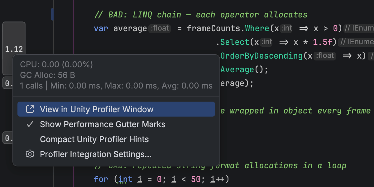 This integration reduces context switching between the Unity Editor and Rider, allowing you to move more naturally between performance data and code when investigating runtime issues.