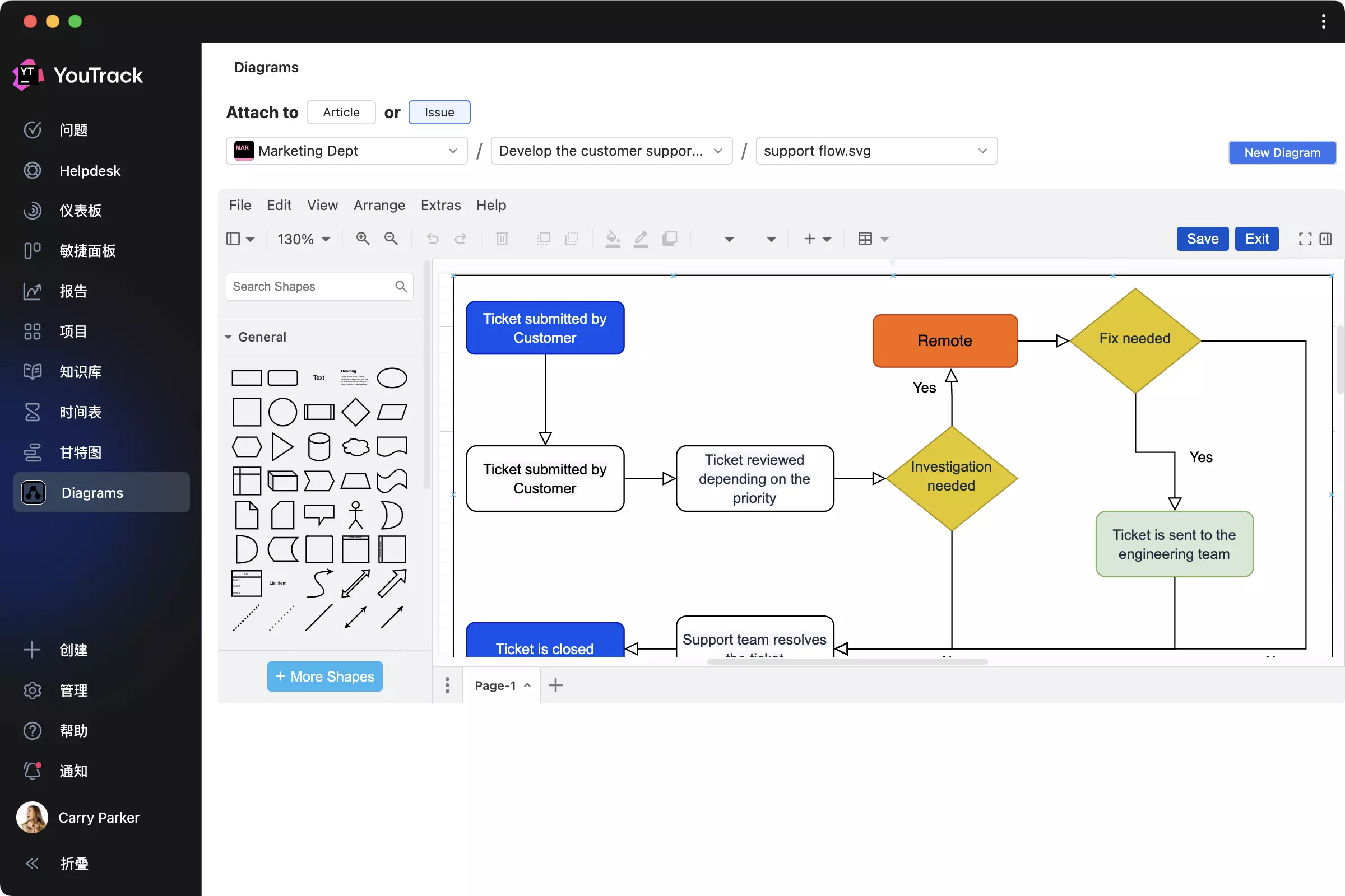从 YouTrack 主菜单上新的 Diagrams(图表)部分创建和编辑 draw.io 图表,并将它们纳入任务和文章,直观呈现流程。