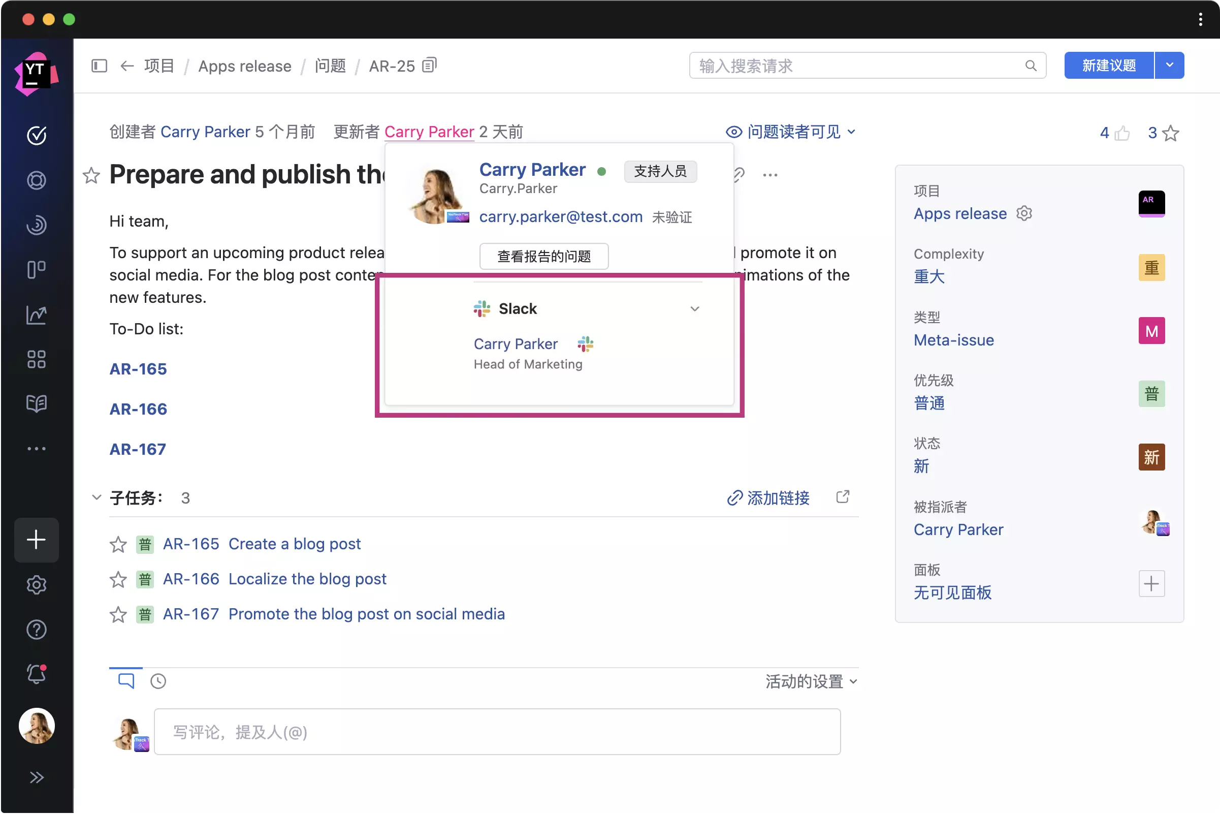 将 Slack 个人资料中的信息和状态添加到 YouTrack 用户卡,并直接从 YouTrack 开始 Slack 对话。