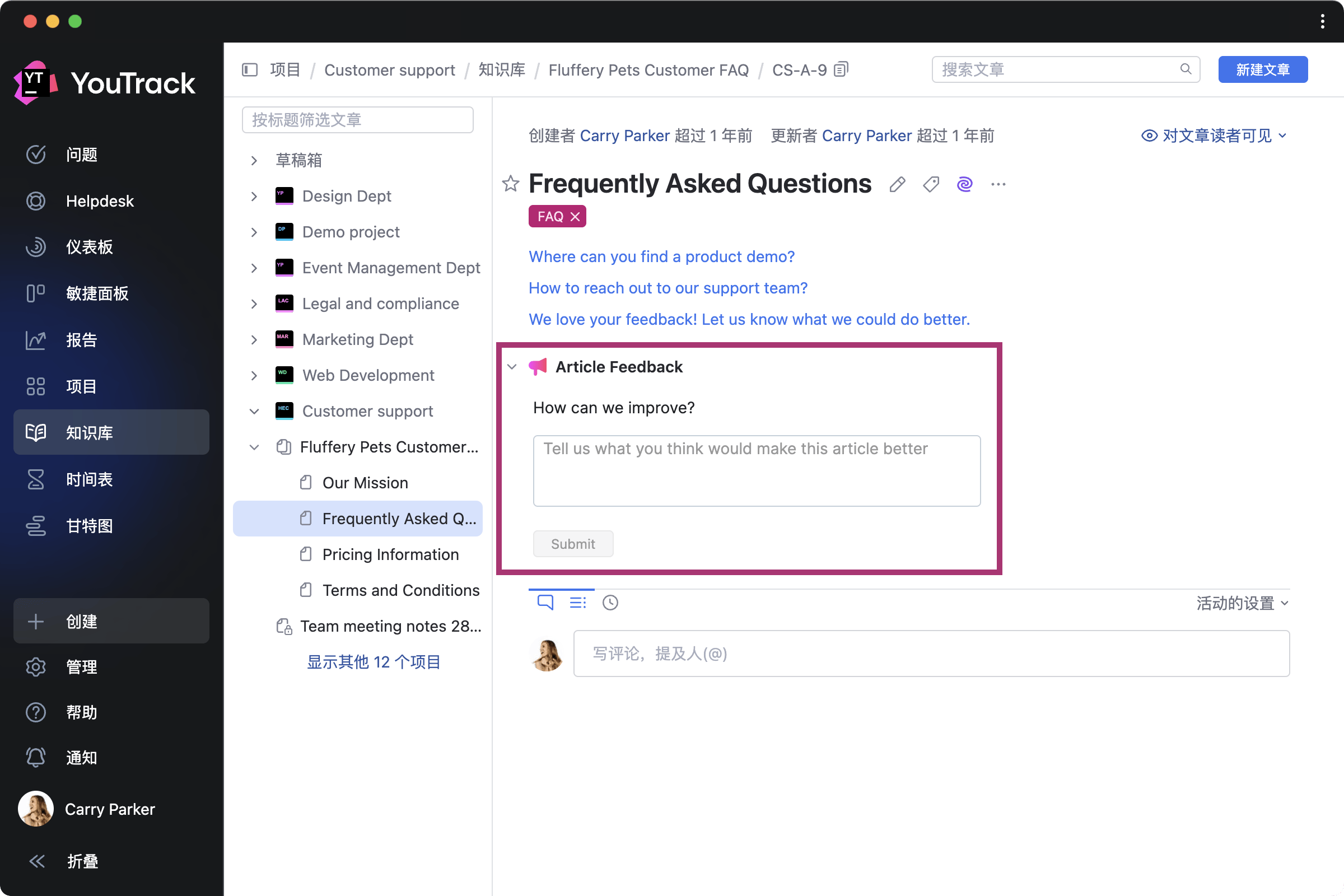 配置知识库的公开部分,让访问者和搜索引擎无需在 YouTrack 中注册即可浏览和查找与您的产品相关的文章和常见问题解答。 强大的筛选器、标签和全文搜索能够让客户轻松找到需要的内容,文章评论则可以帮助注册用户获得问题的答案。 当您想要收集反馈时,可以使用 Article Feedback 应用了解客户的想法。