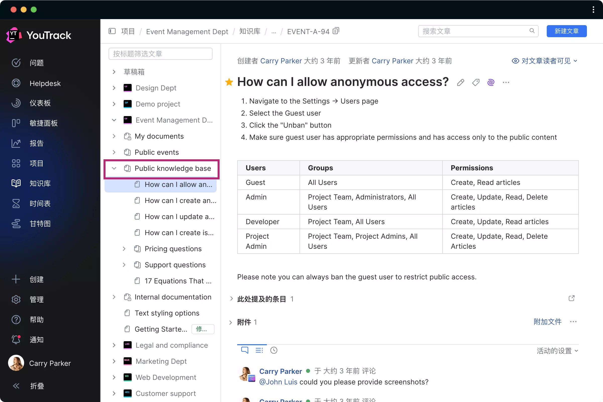 创建、编辑和查看文章的权限设置遵循的原则与 YouTrack 问题中使用的原则完全相同,因此 YouTrack 管理员可以快速上手。 知识库中的每篇文章都有自己的可见性设置,清楚地表明谁有权阅读。