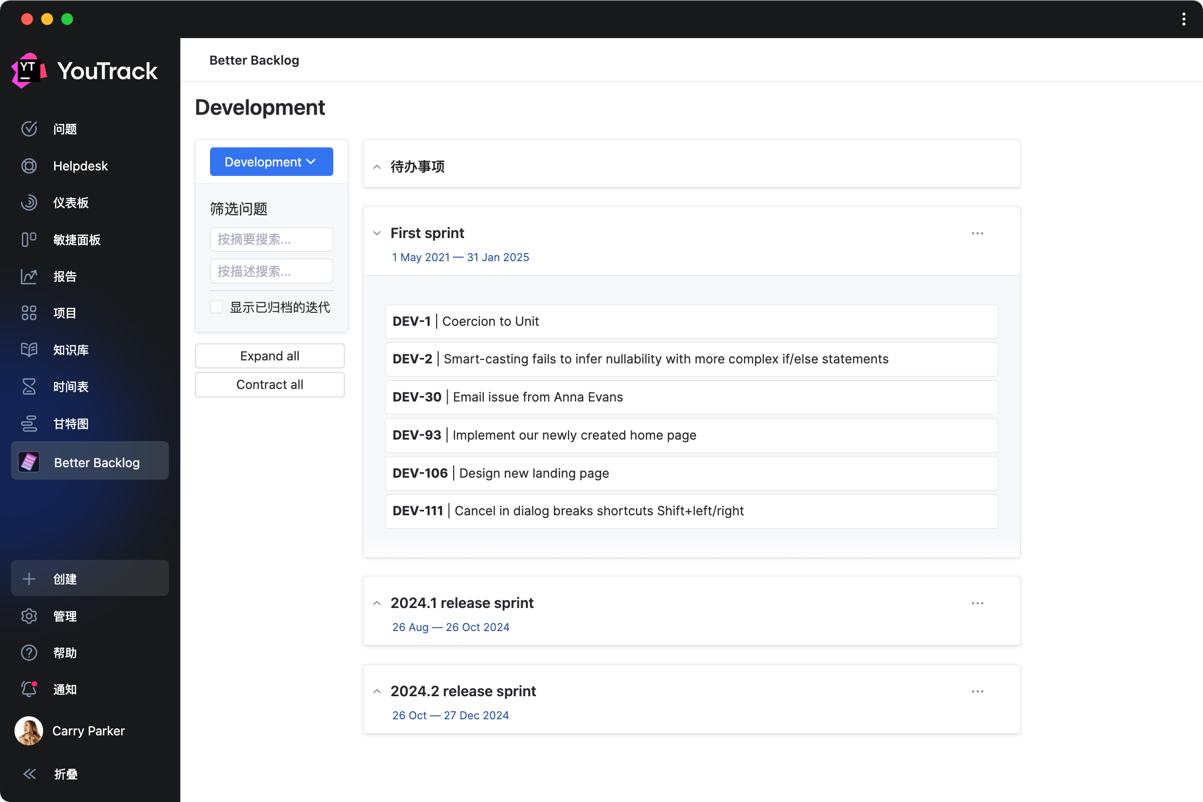 在保存的积压工作中拖放优先级来制定下一步规划,使用泳道对相关任务进行分组,再以 YouTrack 的强大报告跟踪进度。