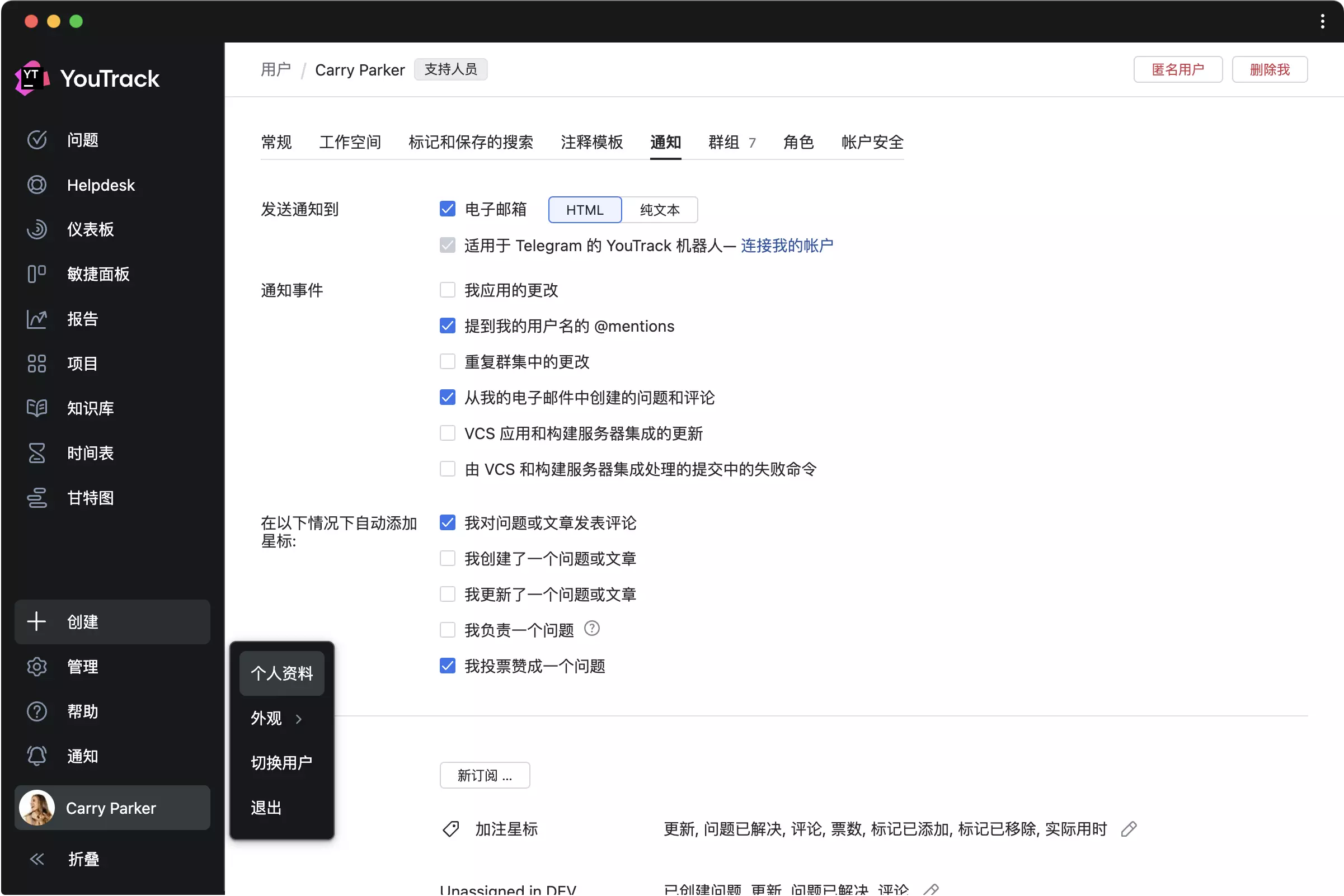 通知设置可配置,让您能够决定将哪些类型的更新发送到电子邮件收件箱。 您甚至可以将其完全关闭,因为 YouTrack 还有很多其他途径可确保您及时掌握信息!