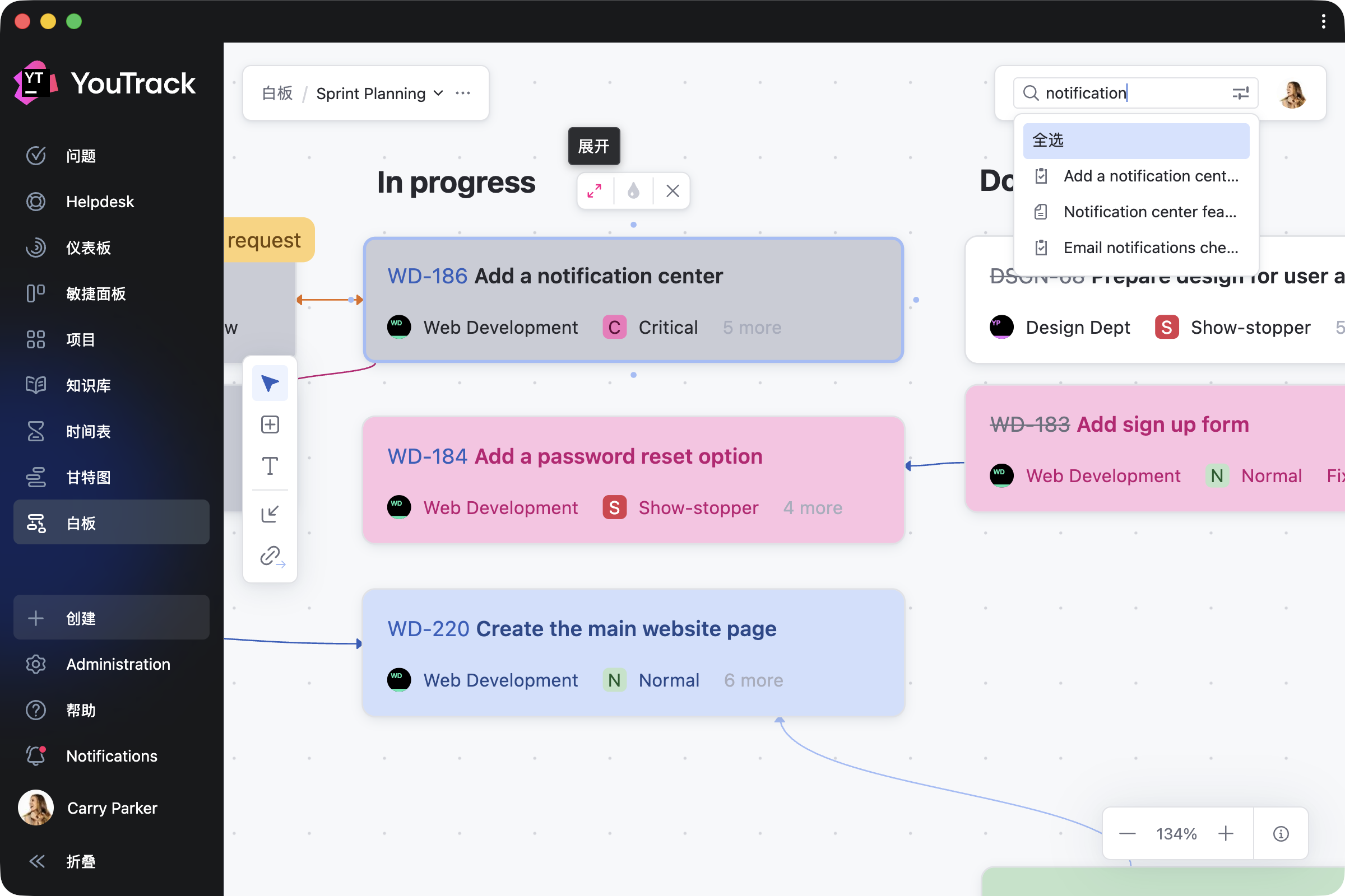 将现有任务、工单和文章导入白板,并随计划调整直接进行更新。 每处更改都会即时同步到所有项目中。 将积压工作任务添加到规划会议中、关联相关文章,或将白板用作当前工作的动态概览。